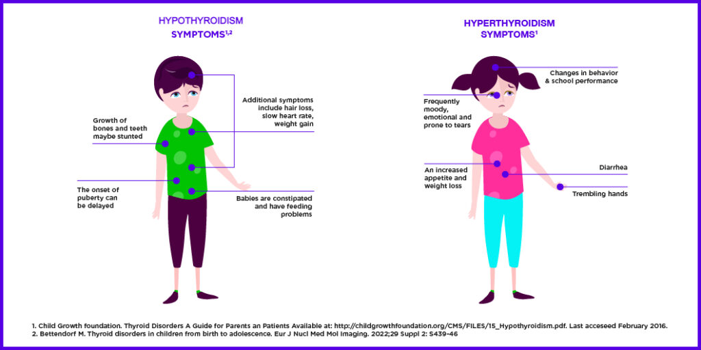 Thyroid hormones play a very important role in healthy growth and development during childhood, impacting metabolism, the nervous system and organ functions.1 Therefore, it is vital that parents understand the signs and symptoms of thyroid disorders. It is also important to remember that treatments are available and that early intervention will help to avoid any long-term issues or complications.1